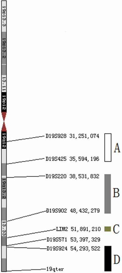 Figure 2. The isolated cataract loci on chromosome 19q. “A” shows the autosomal recessive cataracts locus in a Pakistani family described