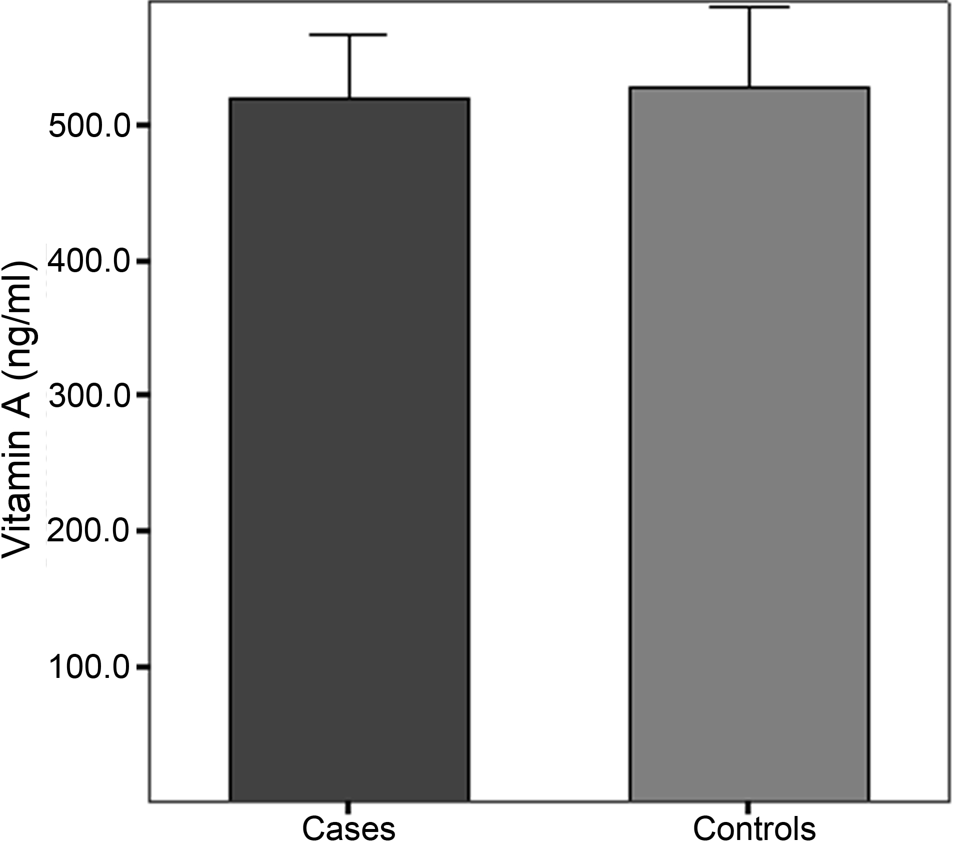 Plasma concentrations of vitamin A (ng/ml) in POAG cases and controls. Differences between means in cases and controls were not statistically significant (p>0.05).