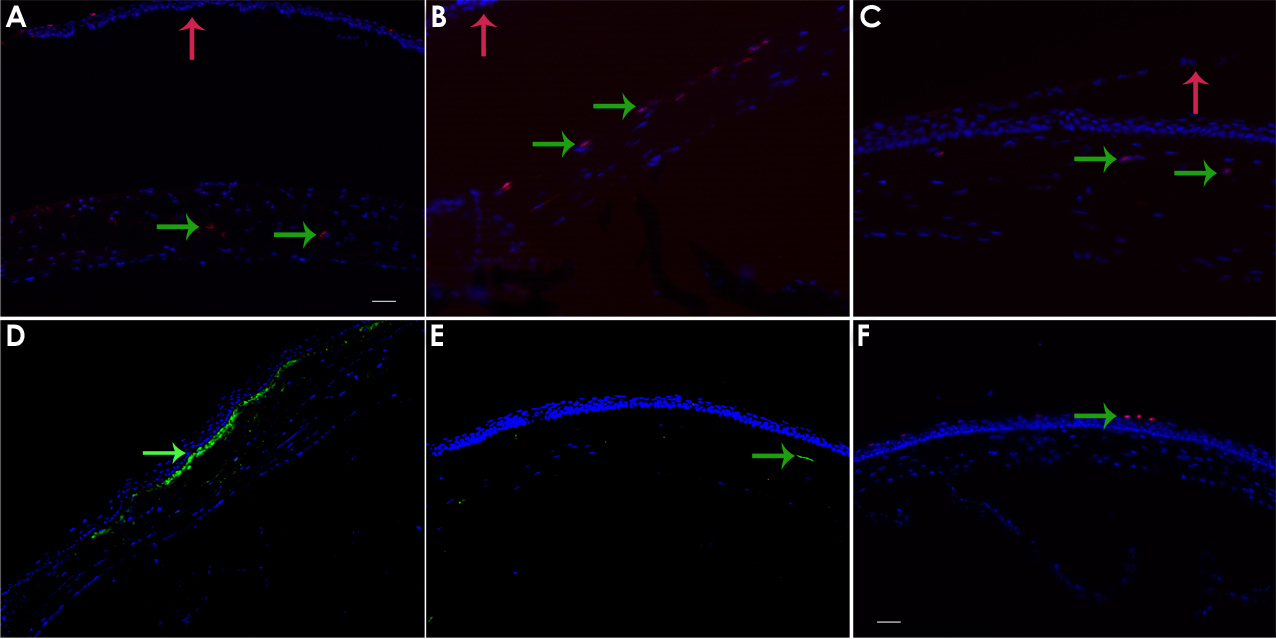 Figure 4. Immunohistochemistry of mouse corneas at various time points. Representative images of immuno-positive staining (green arrows