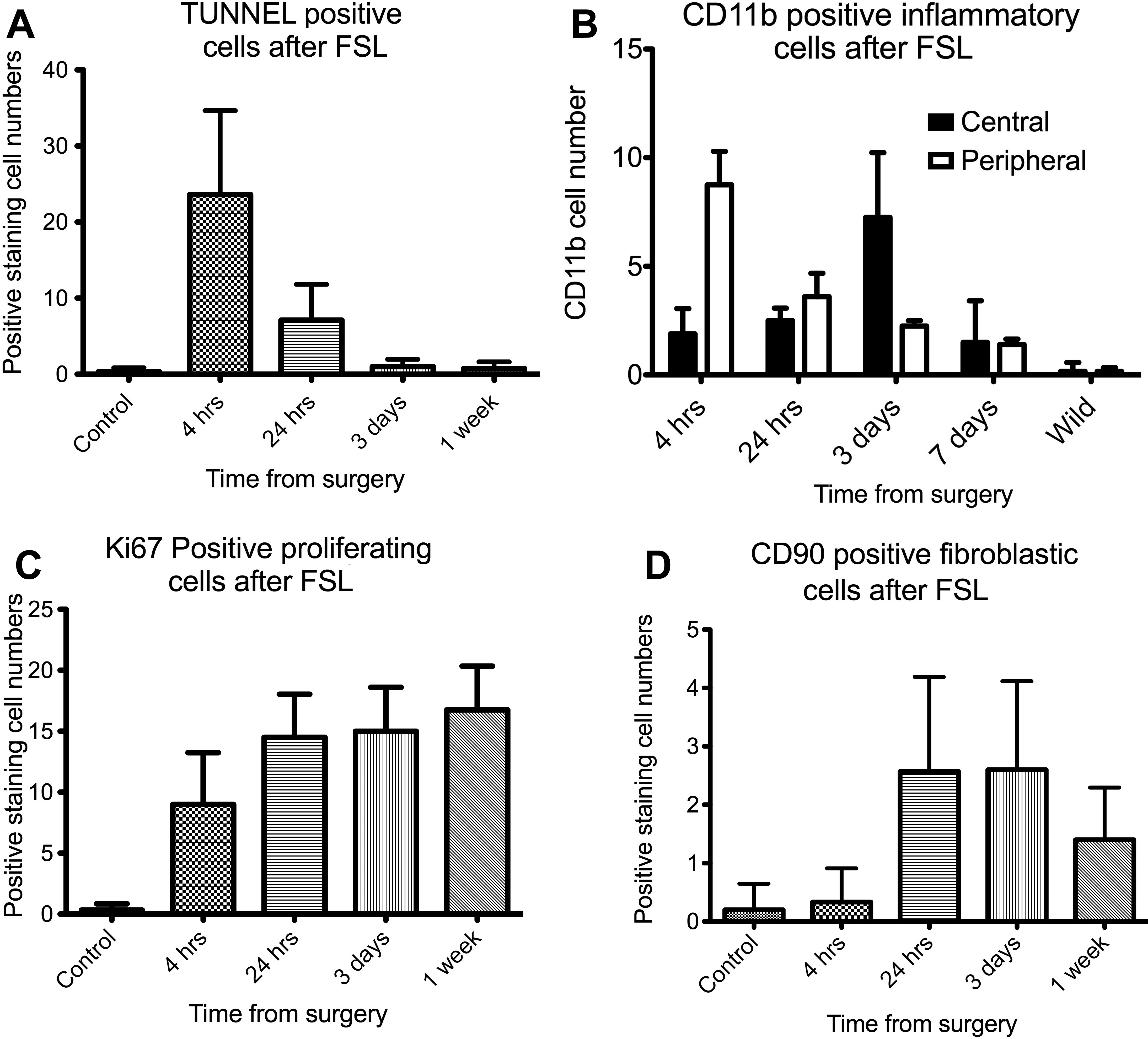 central (black columns) and areas peripheral to the laser