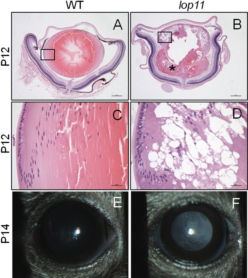 Figure 5. The lop11 lens phenotype after P10. Between P10-P12 lop11 lenses develop vacuolated cataracts that result in the rupture of the lens capsule (B) and release of the lentricular material in the vitreal cavity (asterisk). The boxed areas are depicted at the higher magnification