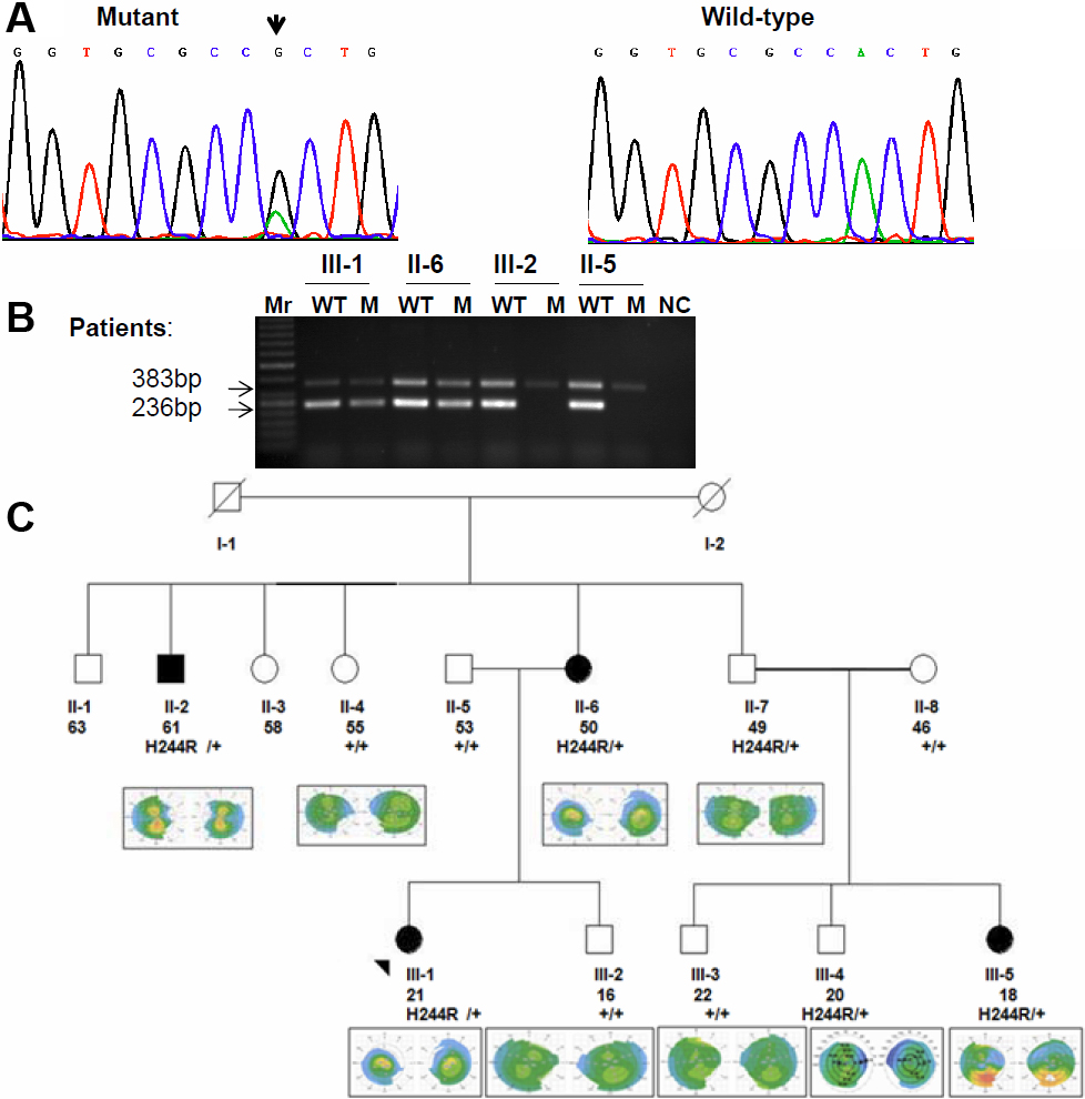mutant primer pairs (236 bp) are indicated. M, 50-bp ladder is present. C: The pedigree of Family 1 show four affected patients (arrow indicates the proband) and segregation of p.H244R through the
