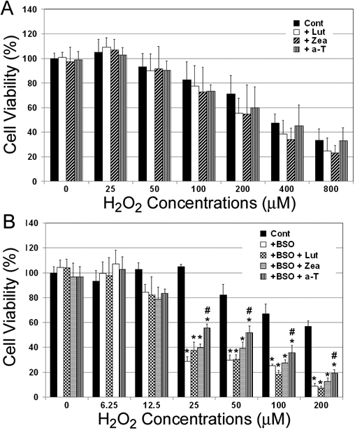 (α-T) for 48 h and then exposed to indicated concentrations of H2O2 for 1 h. B: HLEC were cultured with 1 mM D-L(R:S) buthionine sulfoximine (BSO) in the presence of 5 μM lutein, zeaxanthin or α-tocopherol