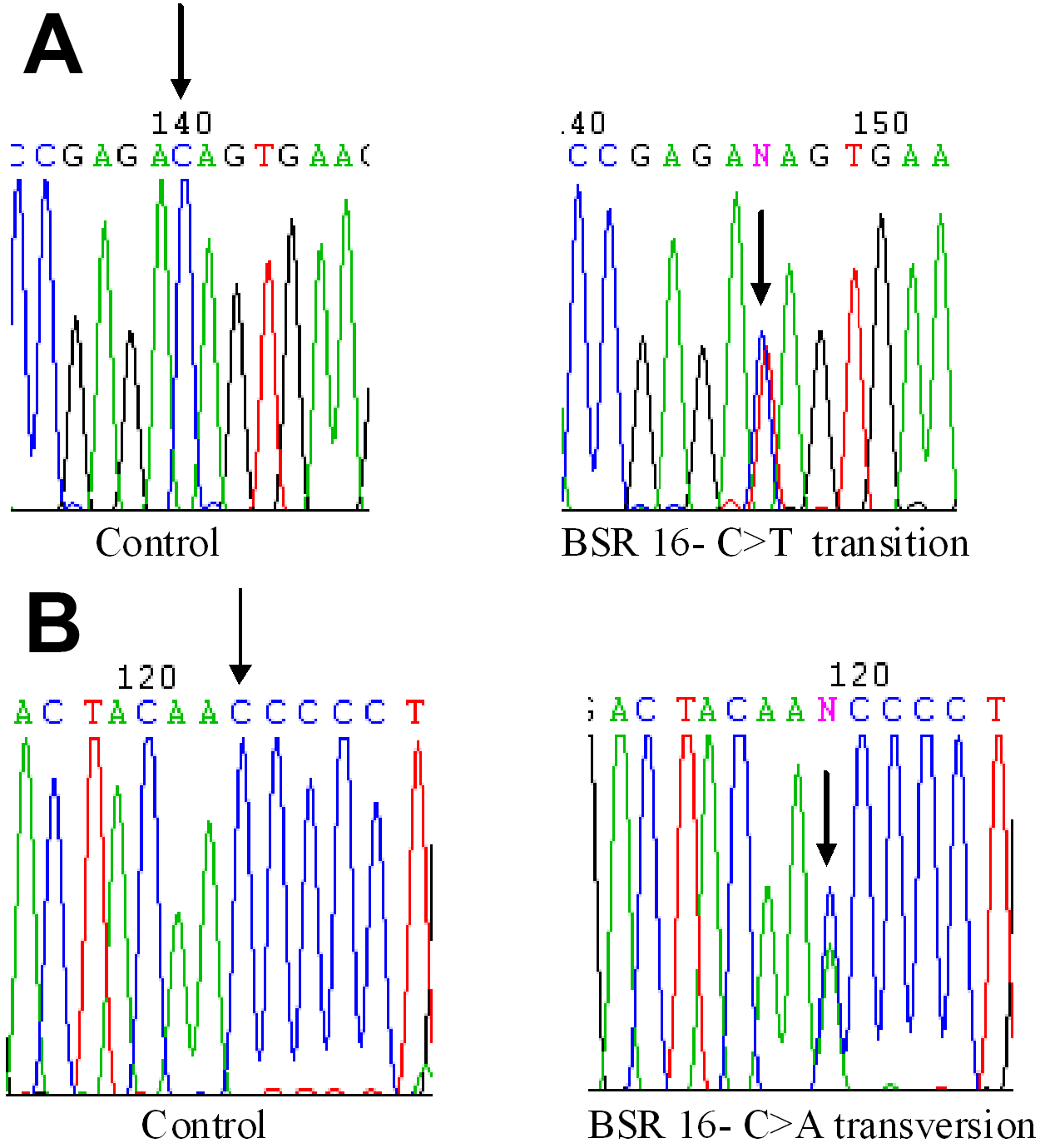 Figure 2. Chromatograms depicting MYOC gene sequence changes in a compound heterozygote POAG patient from India. A: Heterozygous The353Ile mutation in MYOC. Chromatogram sequence derived from patient BSR-16 with the C>T transition (indicated by arrow) compared to the normal control.