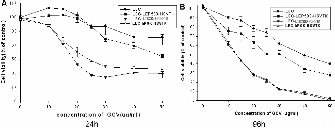 Lenti-hPGK-EGFP-HSVtk for 24 h (A) or 96 h (B). The cell viability of the group treated with the enhanced specific lentiviral vector combination was significantly suppressed