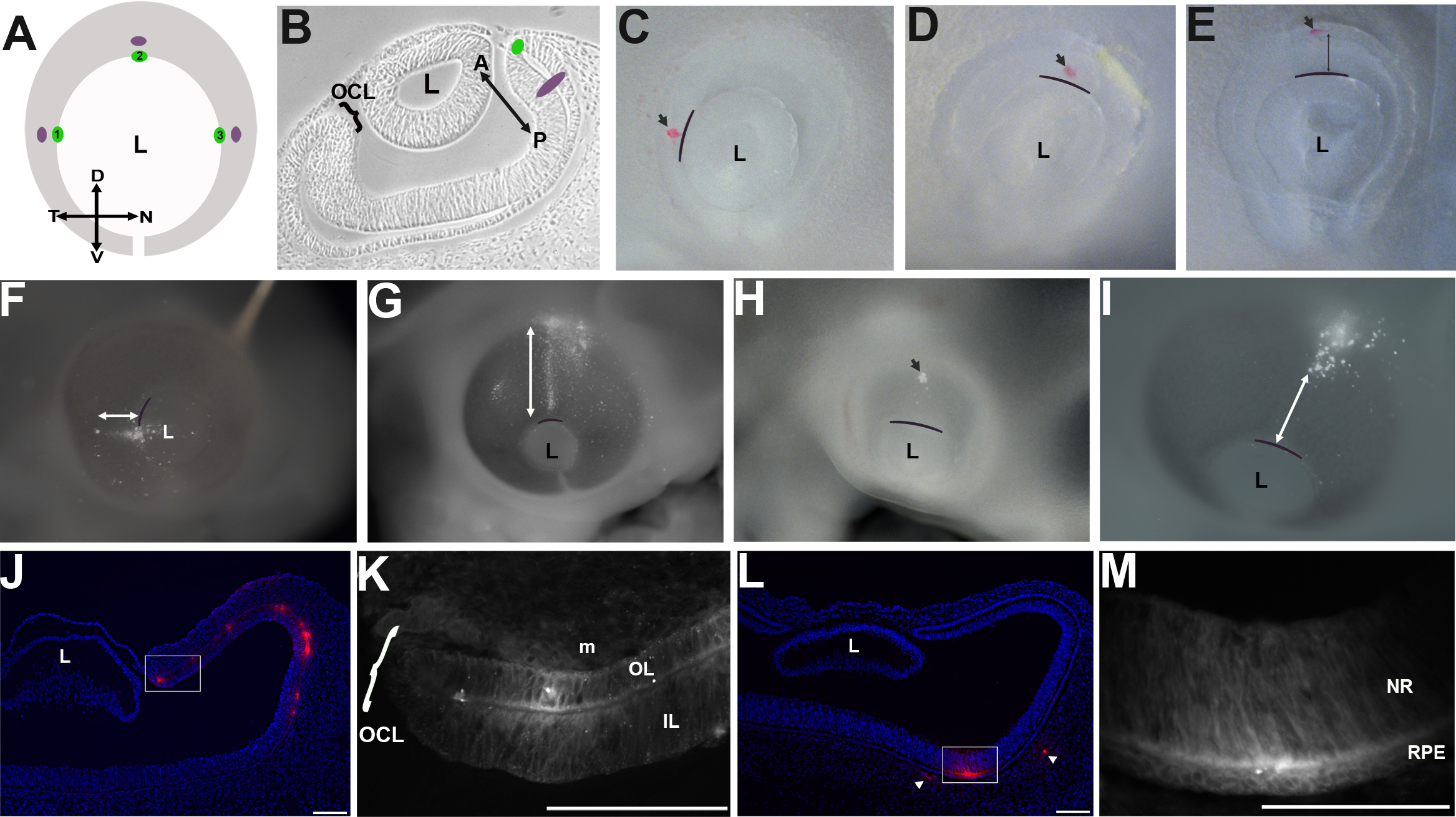 pigmented epithelium. Scale Bars: 100 µm. OCL; Optic Cup Lip, L;