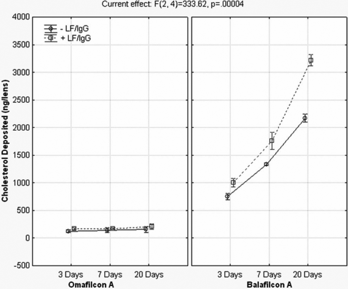 Cholesterol deposition with and without lactoferrin and immunoglobulin G for omafilcon A and balafilcon A. -LF/IgG=no lactoferrin and immunoglobulin G in the ATS. +LF/IgG=lactoferrin and immunoglobulin G were present in the ATS.