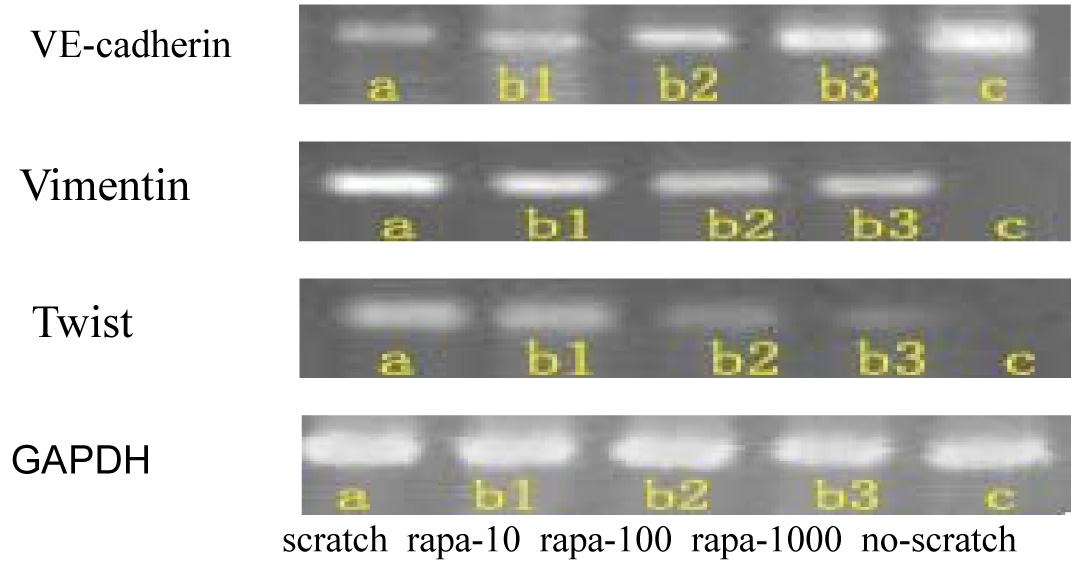vimentin, and Twist. (a, scratch group; b1, 10 ng/ml rapamycin group; b2, 100 ng/ml rapamycin group; b3, 1,000 ng/ml rapamycin group; c, no-scratch group).