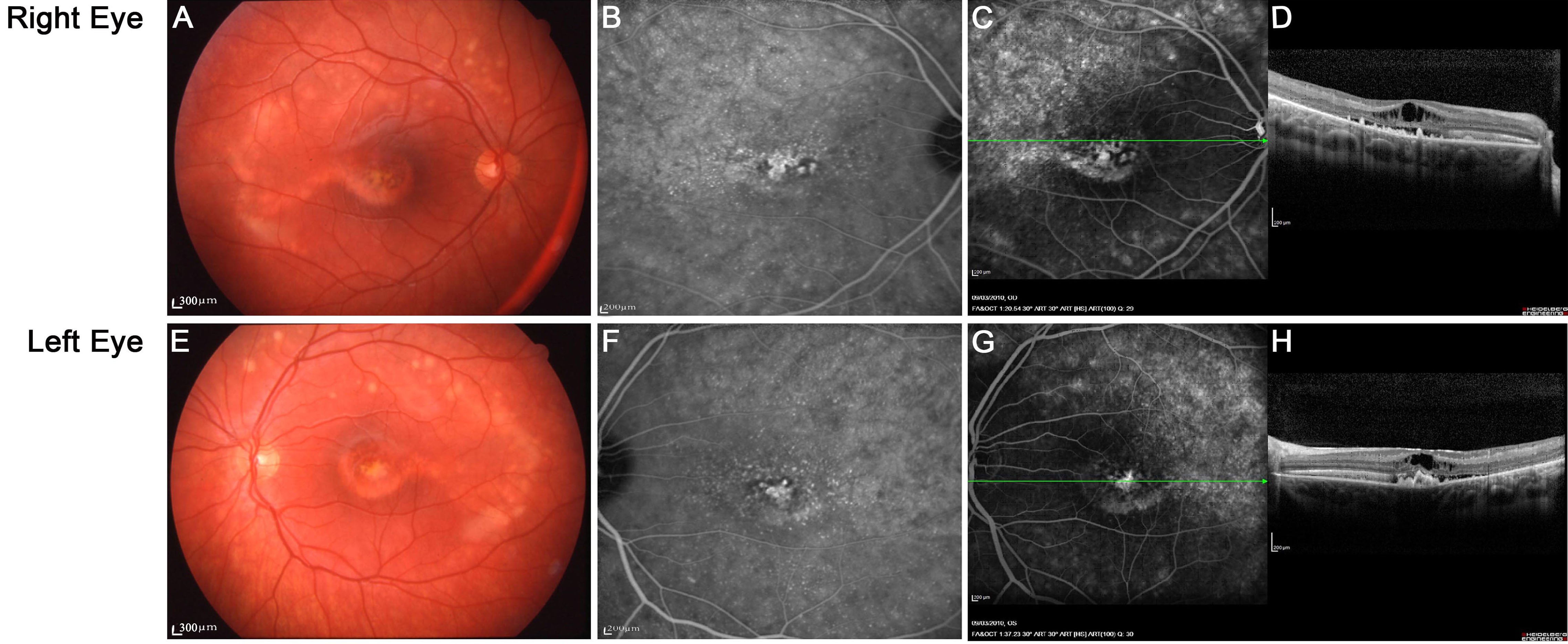 retinal pigment epithelium in both eyes (D-H).