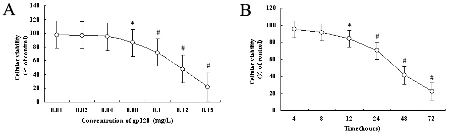 Figure 2. Effects of HIV-1 gp120 on the cell viability of HRCEC. A: Dose–response effects of HIV-1 gp120 for 24 h in an MTT assay. B: Time course of the effects of HIV-1 gp120 on HRCEC. HRCEC were incubated with 0.08 mg/l of HIV-1 gp120 for the times indicated.