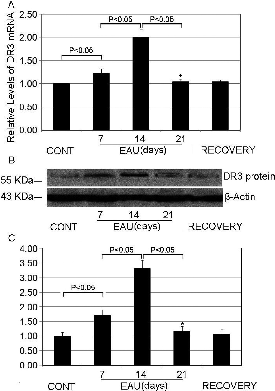 EAU group. B: western blotting analysis of DR3 protein expression in the CD4+ T cells. β-Actin was used as a loading control. C: Densitometry quantification of western-blotting results in panel B. * indicates p<0.05 when day 7 is compared with day 21 in the EAU group. Each value represents the mean±SD (n=6).