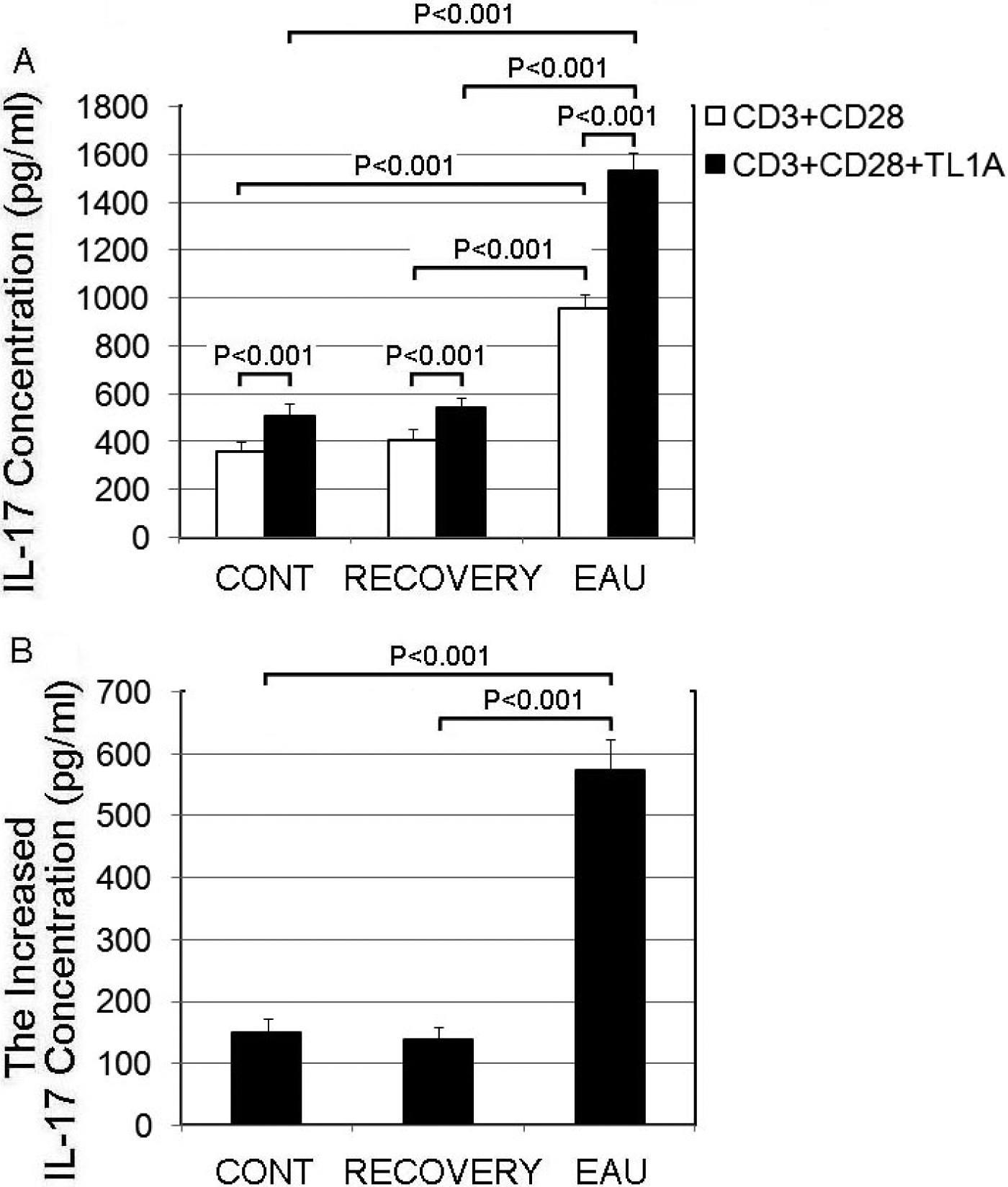 were then determined with ELISA. B: The increased concentration of IL-17 secreted by CD4+ T cell in each group after TL1A stimulation for 72 h. Each value represents