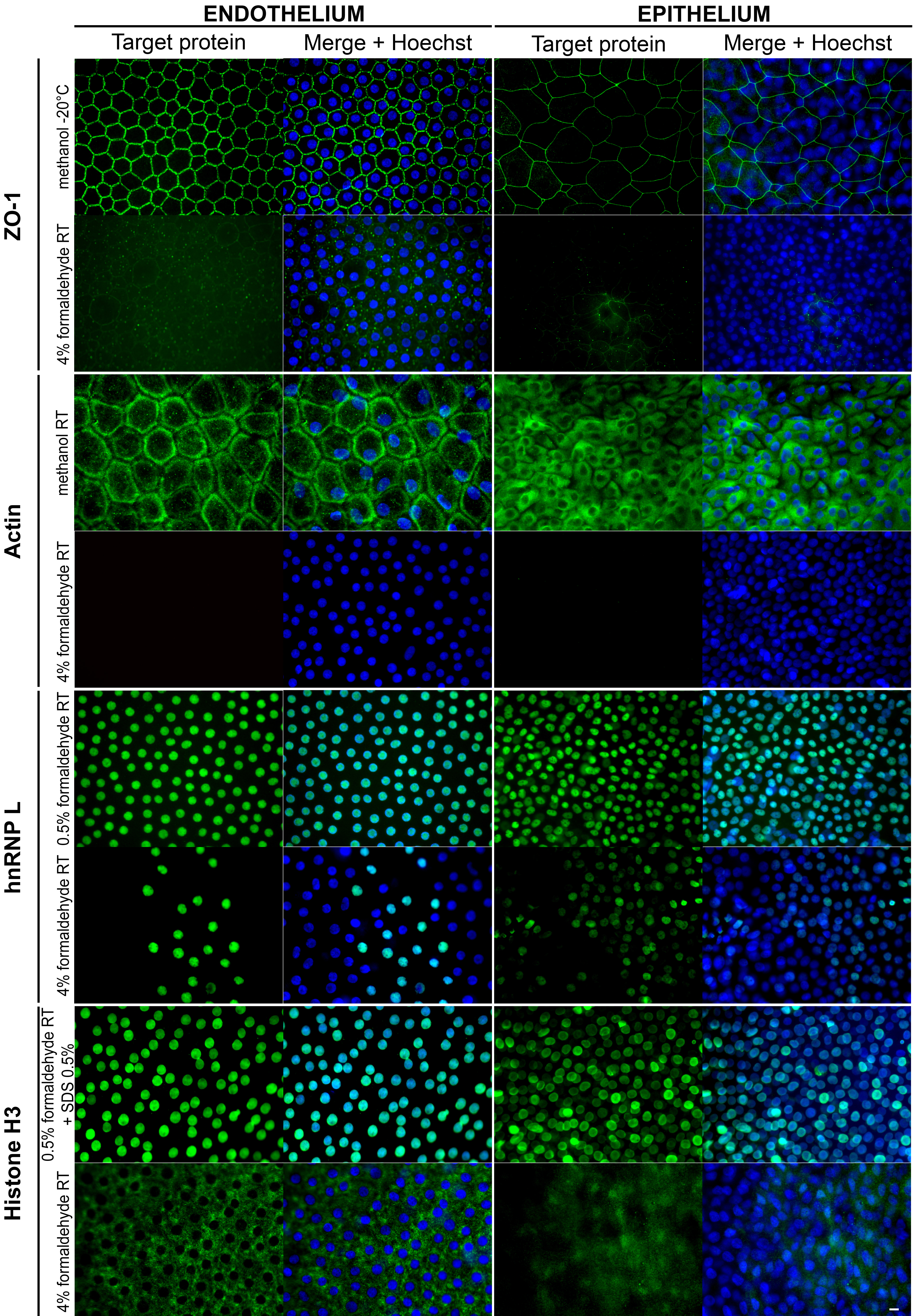 immunolocalization of ZO-1, actin, hnRNP L, and histone H3 in