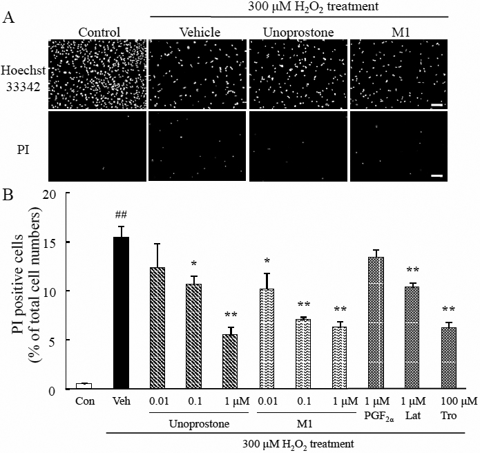 Figure 1. Unoprostone and M1 suppressed H2O2-induced photoreceptor cell death. A: Representative fluorescence microscopic images showing nuclear staining for Hoechst 33342 and PI after 24 h H2O2 treatment. Unoprostone (0.01–1 µM), M1 (0.01–1 µM), PGF2α (1 µM), and latanoprost (1 µM) or trolox (100 µM) were added 1 h before H2O2 treatment. B: The number of cells exhibiting PI fluorescence was counted, and expressed as the percentage of PI positive cells to Hoechst