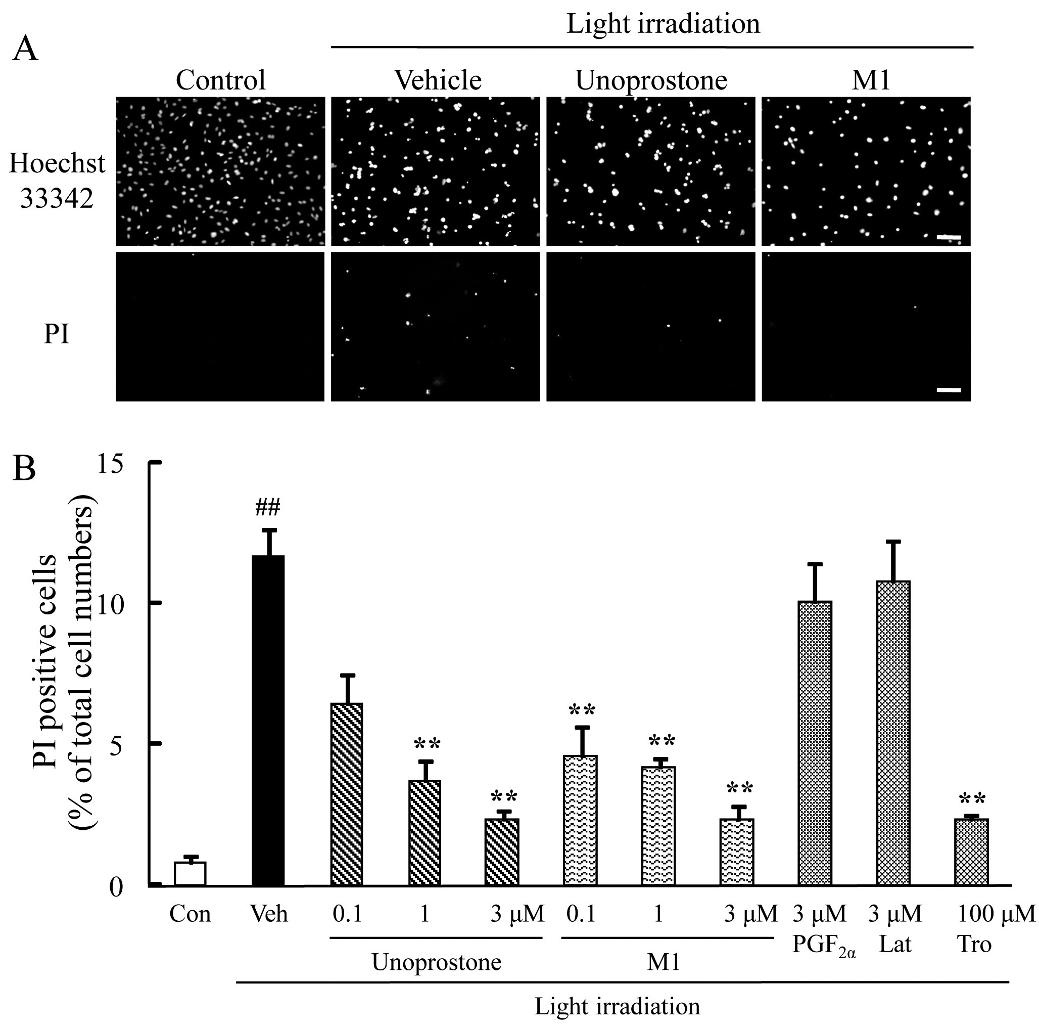 PI after 24 h light irradiation. Unoprostone (0.1–3 µM), M1