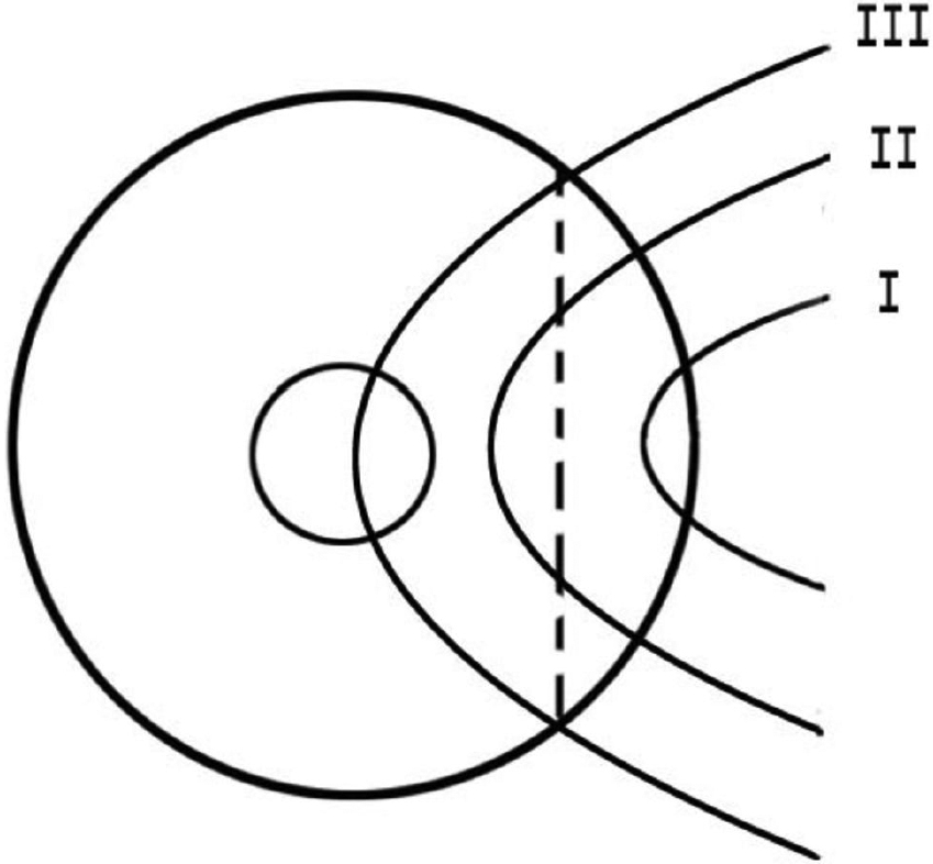 Figure 1. Schematic picture shows the different stages of pterygia. Stage 1: The head of pterygia did not reach the midline between