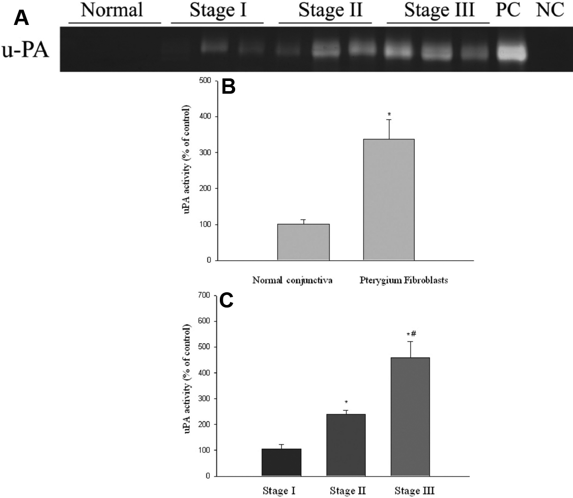 *Significant difference (p<0.05) between the normal and pterygium fibroblasts. C: Levels of uPA activity in conditioned media of fibroblasts from various stages of pterygium. Data are given as mean±SD *Significant
