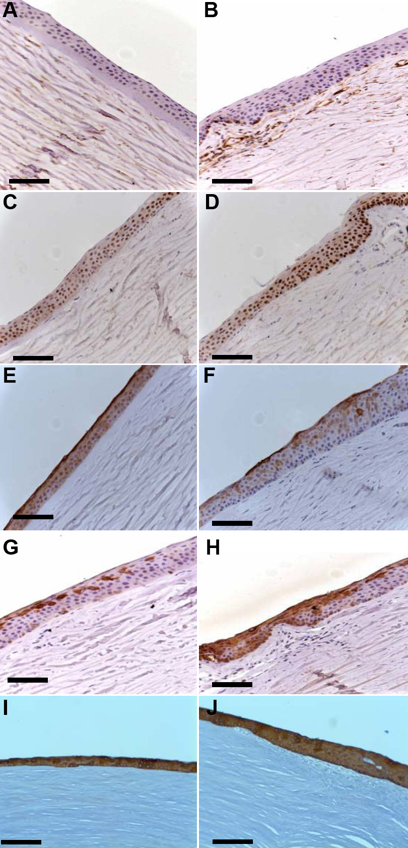Figure 5. Immunohistochemical staining of normal central cornea and limbus. Vimentin (A, B), delta N p63α (C, D), cytokeratin 3 (E, F), cytokeratin 19 (G, H), and broad spectrum cytokeratins (MNF116; I, J) in normal central cornea and limbus. Vimentin is not detected in corneal epithelial cells (A) but is detected in the basal limbal epithelial layer and stromal cells (B). Delta N p63α is strongly expressed in the basal layer of the limbus (D). The entire superficial limbal epithelial layer and cells in the mid layer are positive for CK3 (F). CK19 labels the basal and superficial limbal epithelial layers whereas cells in the mid layer are not stained by anti-CK19.