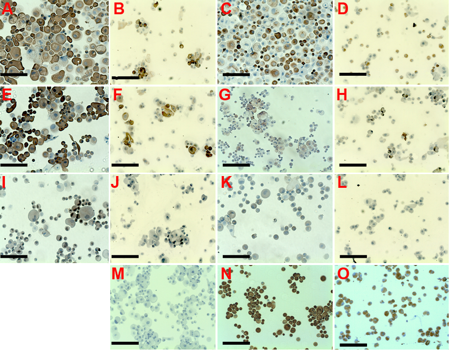 medium. Staining for CK3 (A: superficial limbal explants; B: full thickness limbal explants), vimentin (C: superficial limbal explants. D: full thickness limbal explants), broad spectrum cytokeratins (CK4, 5, 6, 8, 10, 13, and 18; E: superficial limbal explants; F: full thickness limbal explants), CK19 (G: superficial limbal explants; H: full thickness limbal explants), delta N p63α (I: superficial limbal explants; J: full thickness limbal explants), ABCG2 (K: superficial limbal explants; L: full thickness limbal explants) of limbal cells; M: negative control; N: positive control (human corneal epithelial cells stained with CK3). O: keratocytes stained with vimentin. Bars: 200 µm; magnification: 10×.