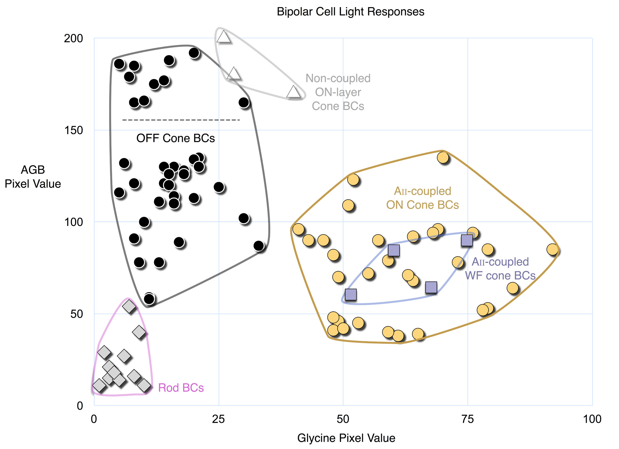 OFF cone bipolar cells (black) have some of the strongest light-driven