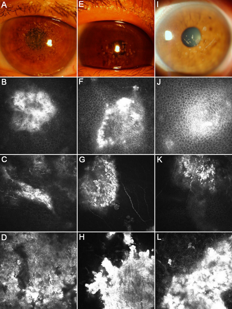 Figure 3. Representative images of affected members in the three families were compared by slit-lamp examination and in vivo LSCM. A-D: patient I:2 from family A; E-H: patient II:13 from family B; I-L: patient II:7 from family C. The eye of the proband’s mother revealed grayish annular and crumb-like opacities covered almost