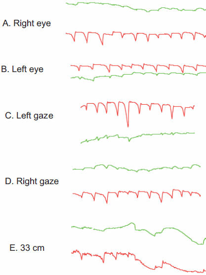 eyes of the proband showed horizontal nystagmus (A and B). The ocular oscillation could be dampened at neither the left (C) nor the right (D) gaze of 10°, but could be achieved at a viewing distance of 33 cm (E). The vertical component of the eye movement is denoted in green, and the horizontal movement is shown in red.