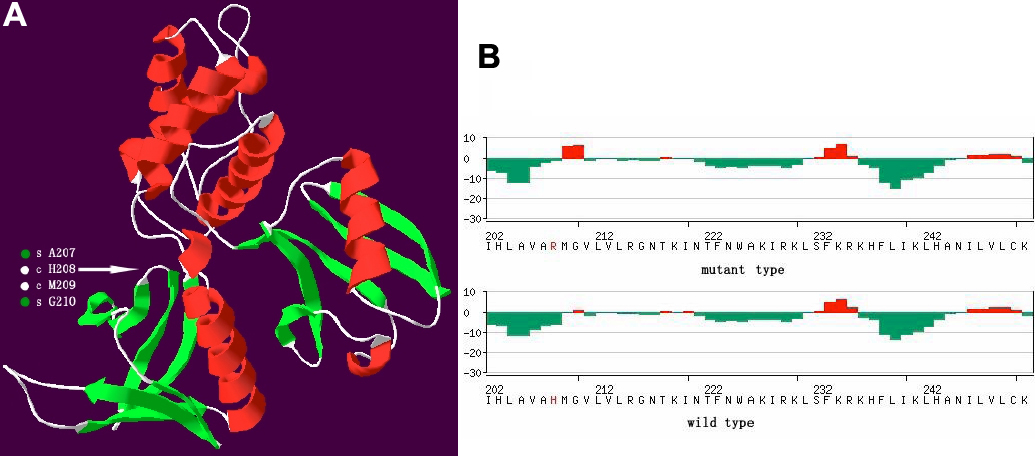 Figure 6. The 3D model and the anolea mean force potential plot for the target protein of human FRMD7. A: The model rendered in 3-D for the target human FRMD7 protein. α-helices, coils, and β-sheets are depicted in red, gray,