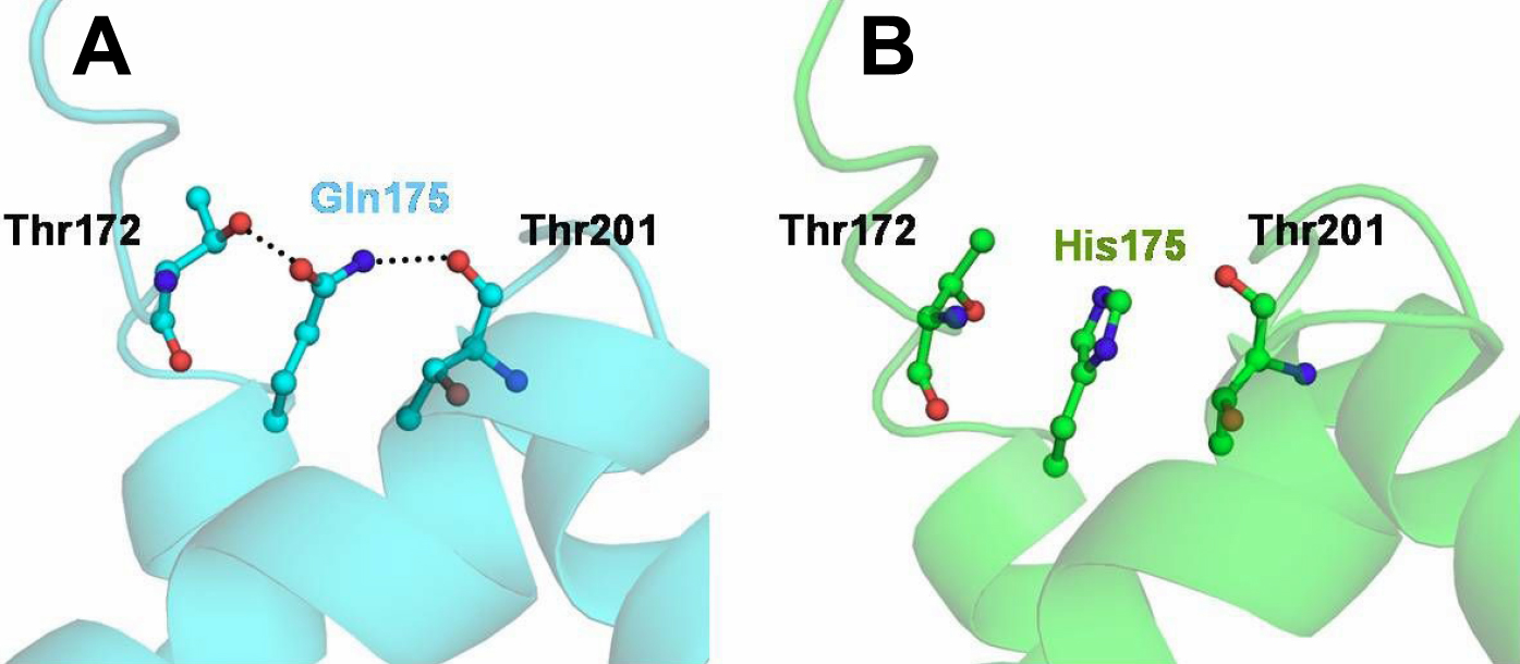 Close view of the VSX1 Q175H mutation area. The hydrogen bond interactions are marked for clarity in the wild type (