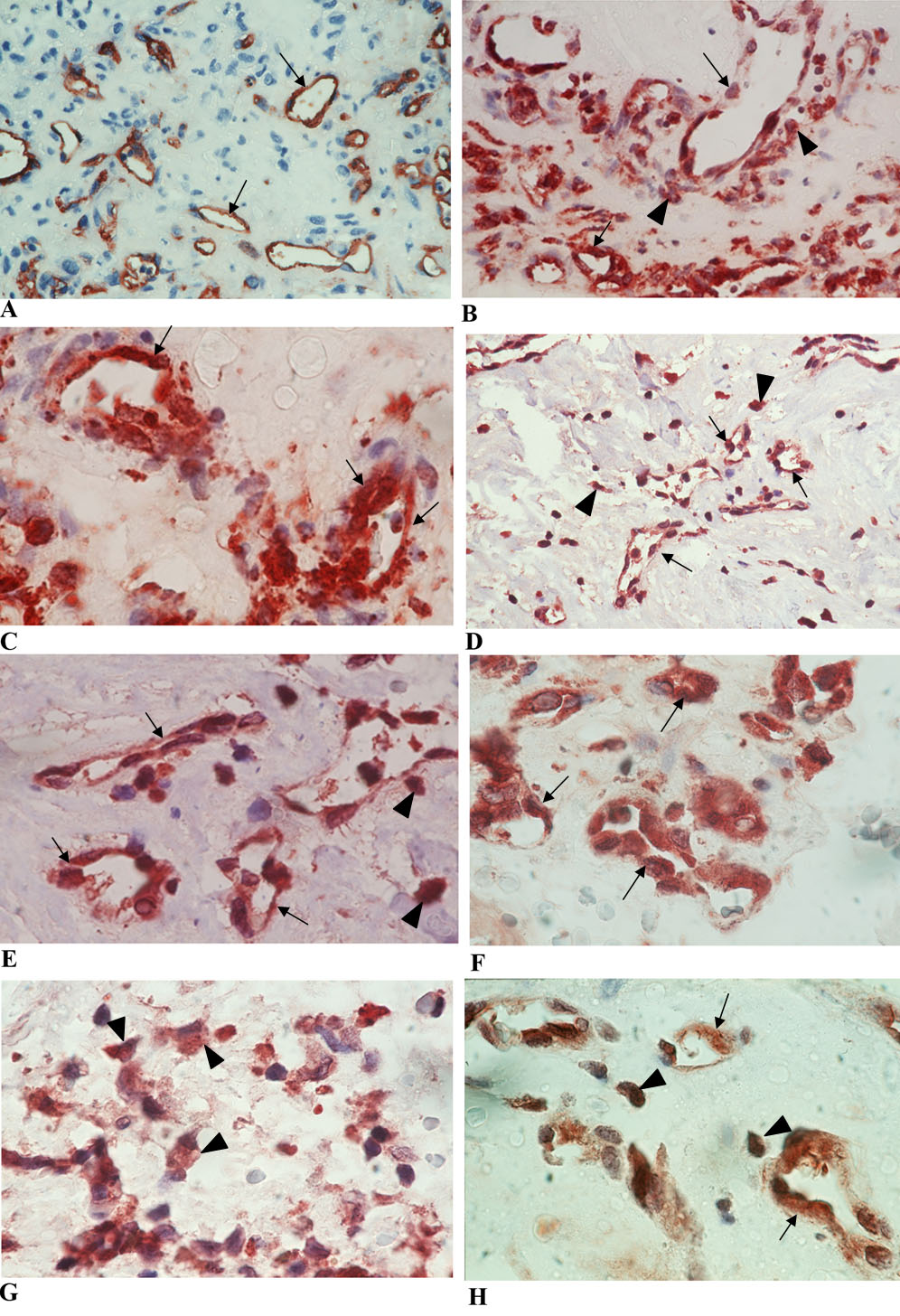 showing immunoreactivity in vascular endothelial (arrows) and stromal (arrowheads) cells (H; original magnification 100×).