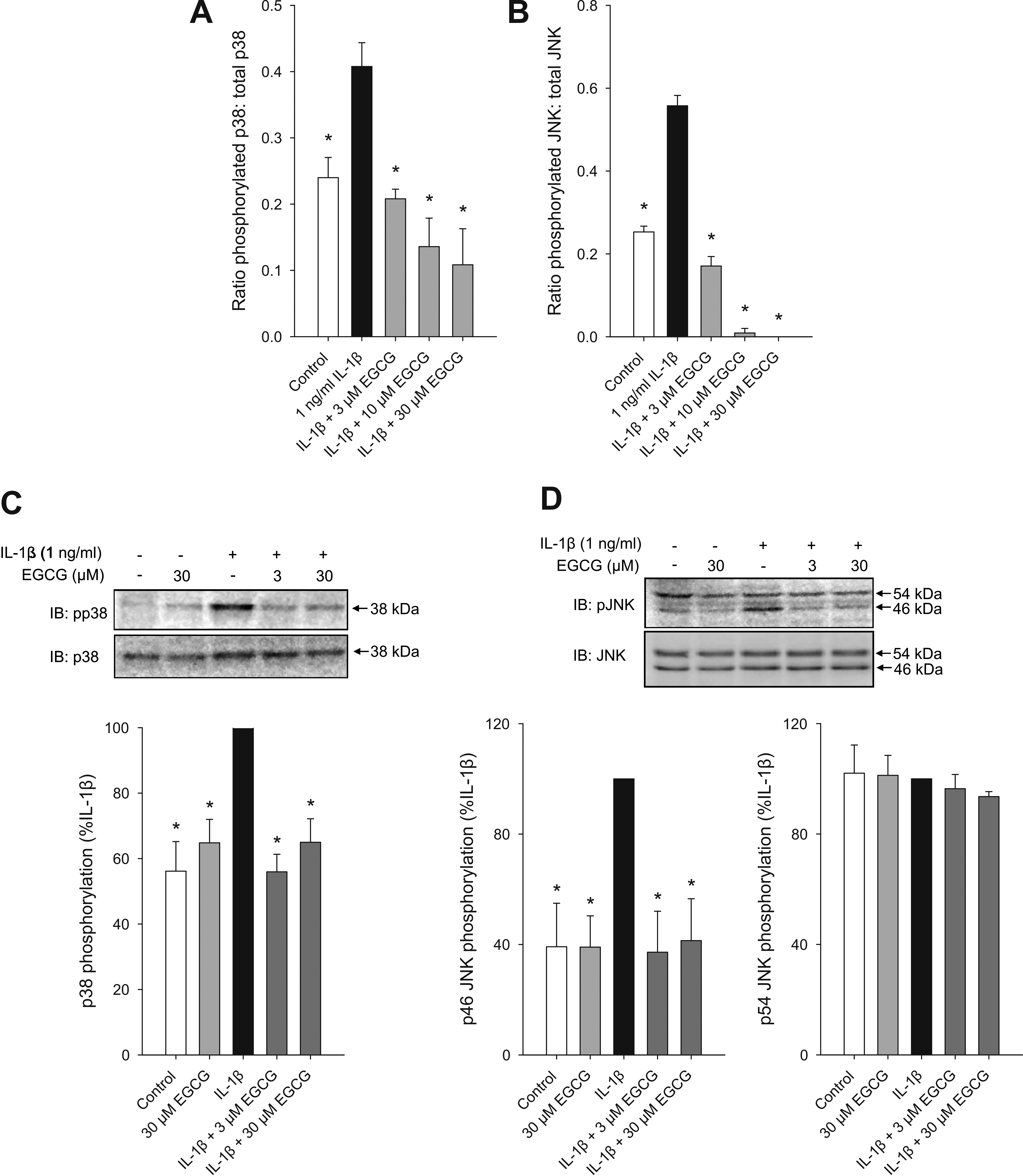 IL-1β + EGCG for 30 min. Phosphorylated p38 and JNK levels were