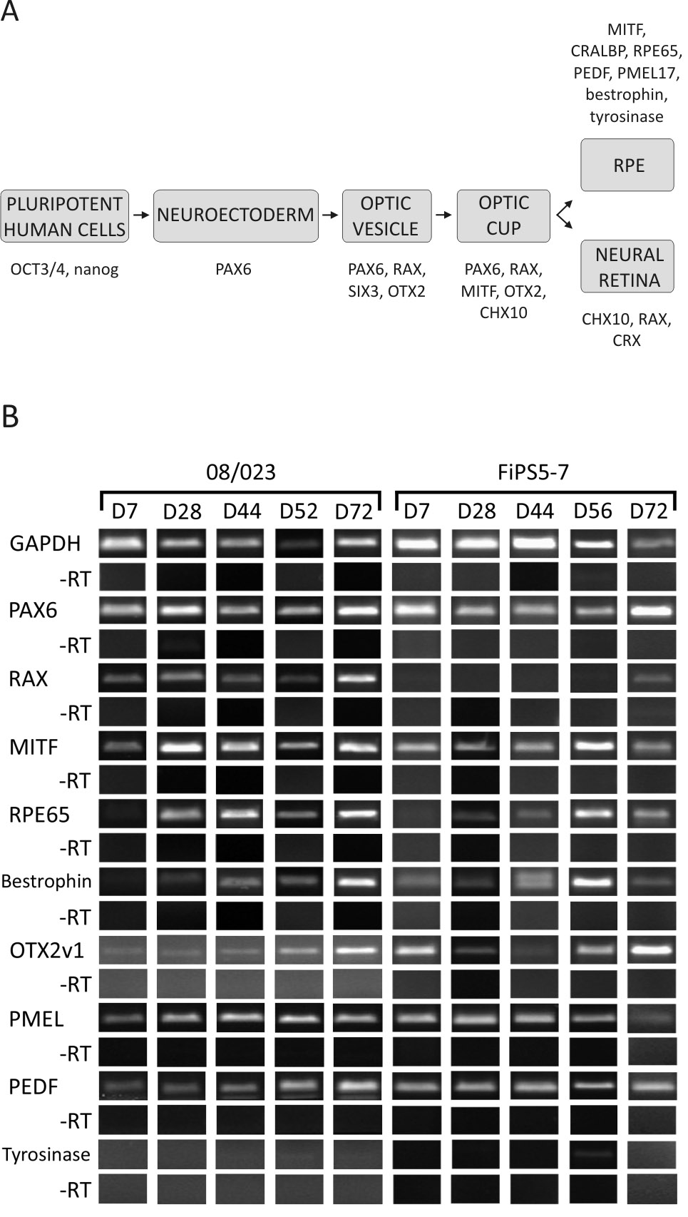 Figure 1. Differentiation of human pluripotent stem cells toward retinal pigment epithelium cells. A: A schematic representation of retinal pigment epithelium (RPE) cell differentiation during retinal development. B: Reverse transcription (RT)–PCR analysis of typical genes for retinal development expressed during putative RPE differentiation