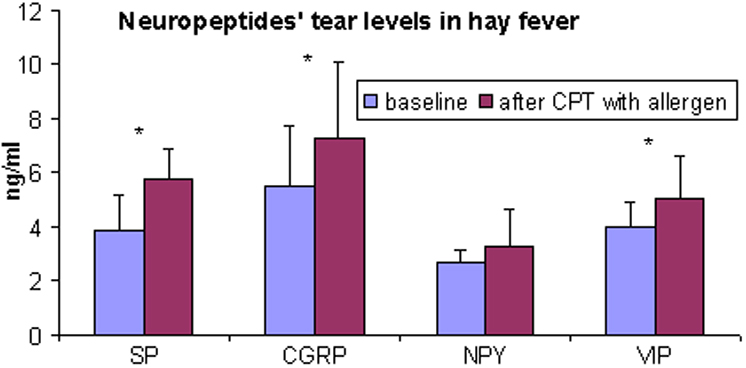 In allergic patients SP, CGRP, and VIP but not NPY tear levels significantly increase after a positive CPT.