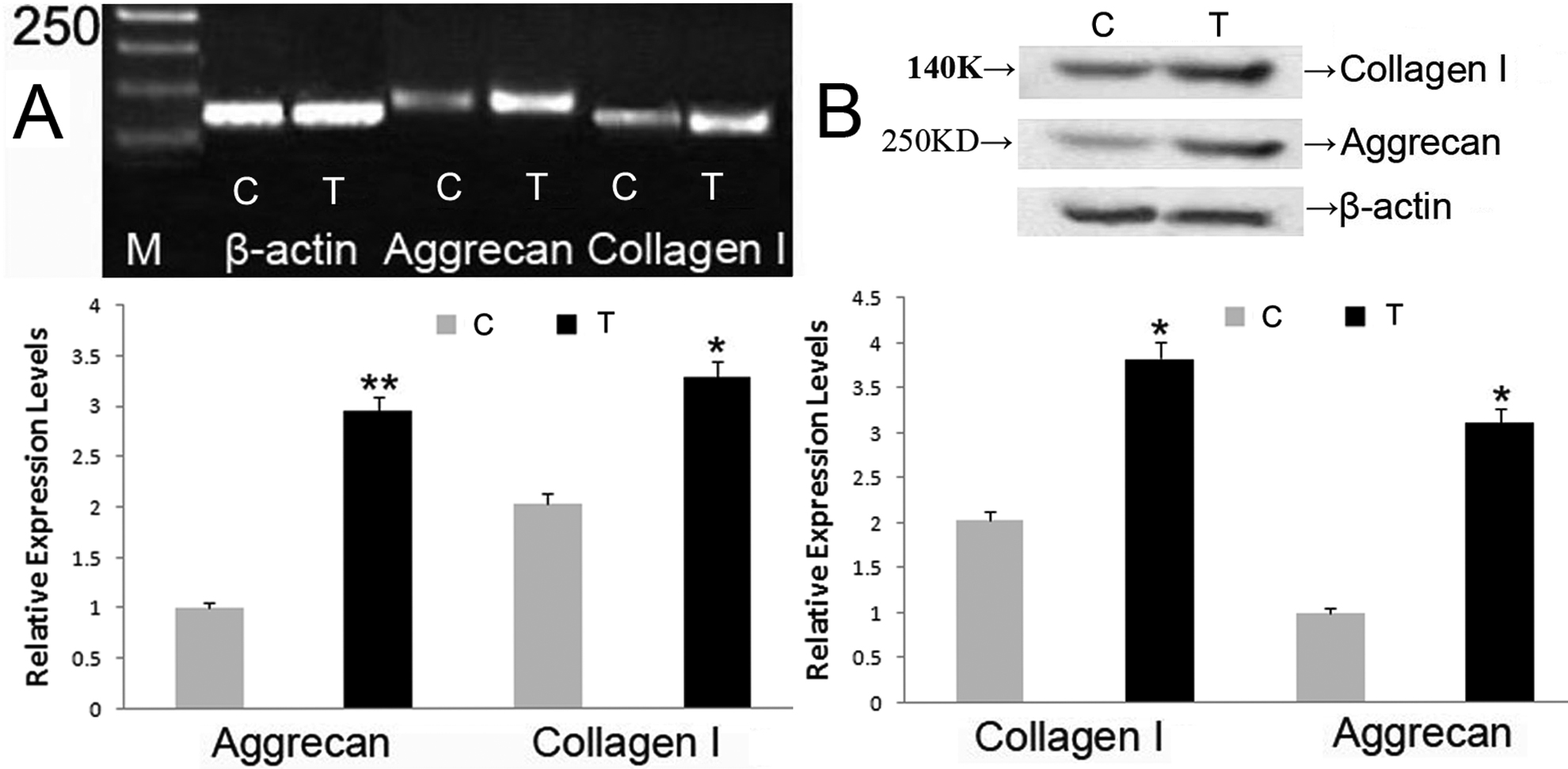 collagen I and aggrecan. The mRNA (A) and protein (B)
