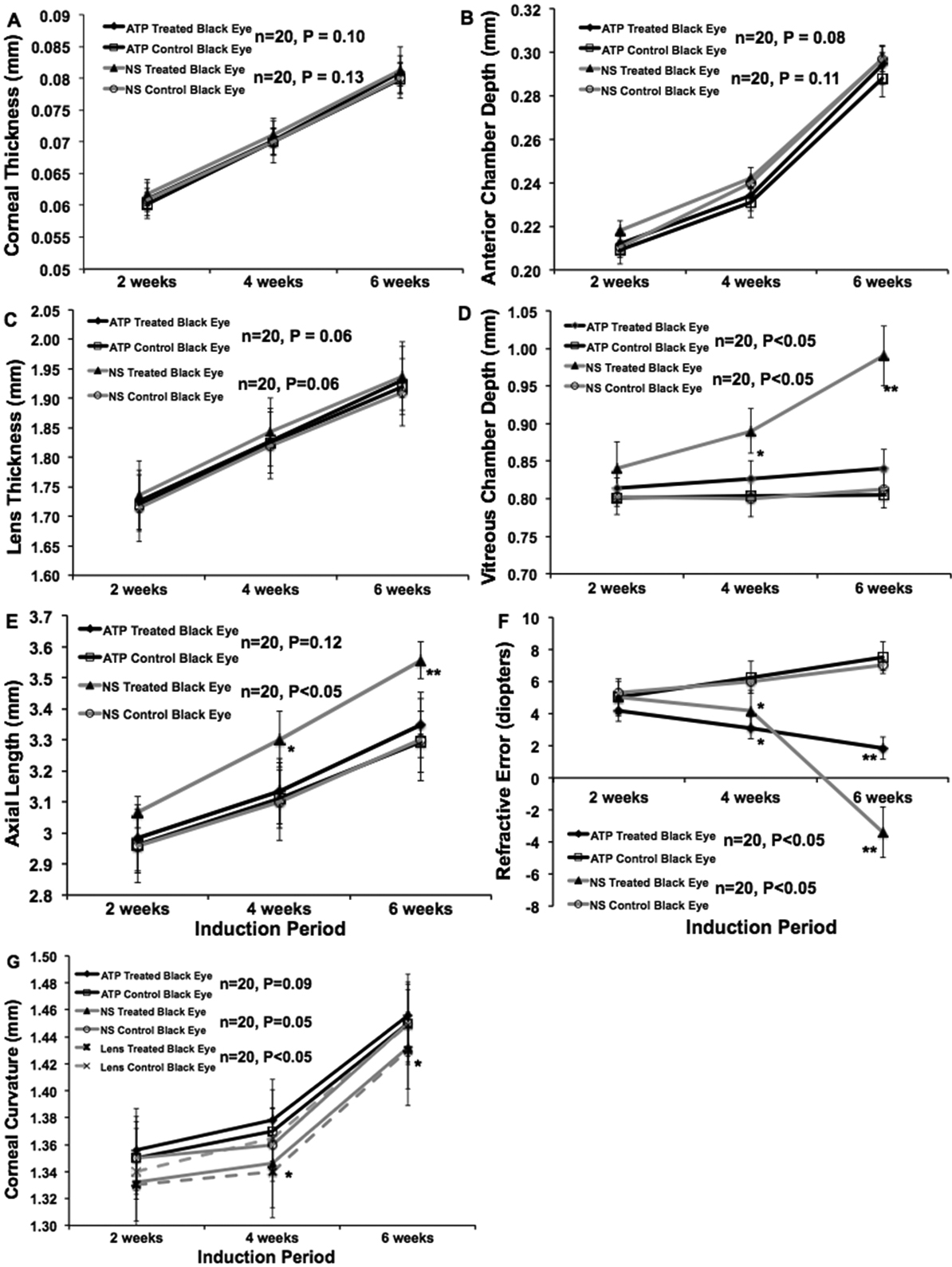 The minus lens wearing eye’s corneal curvature was slightly flatter than the control and atropine treated eyes (G). This was significant at 4 and 6 weeks after induction of myopia. Spectacle lens-induced myopic eye received 1% atropine