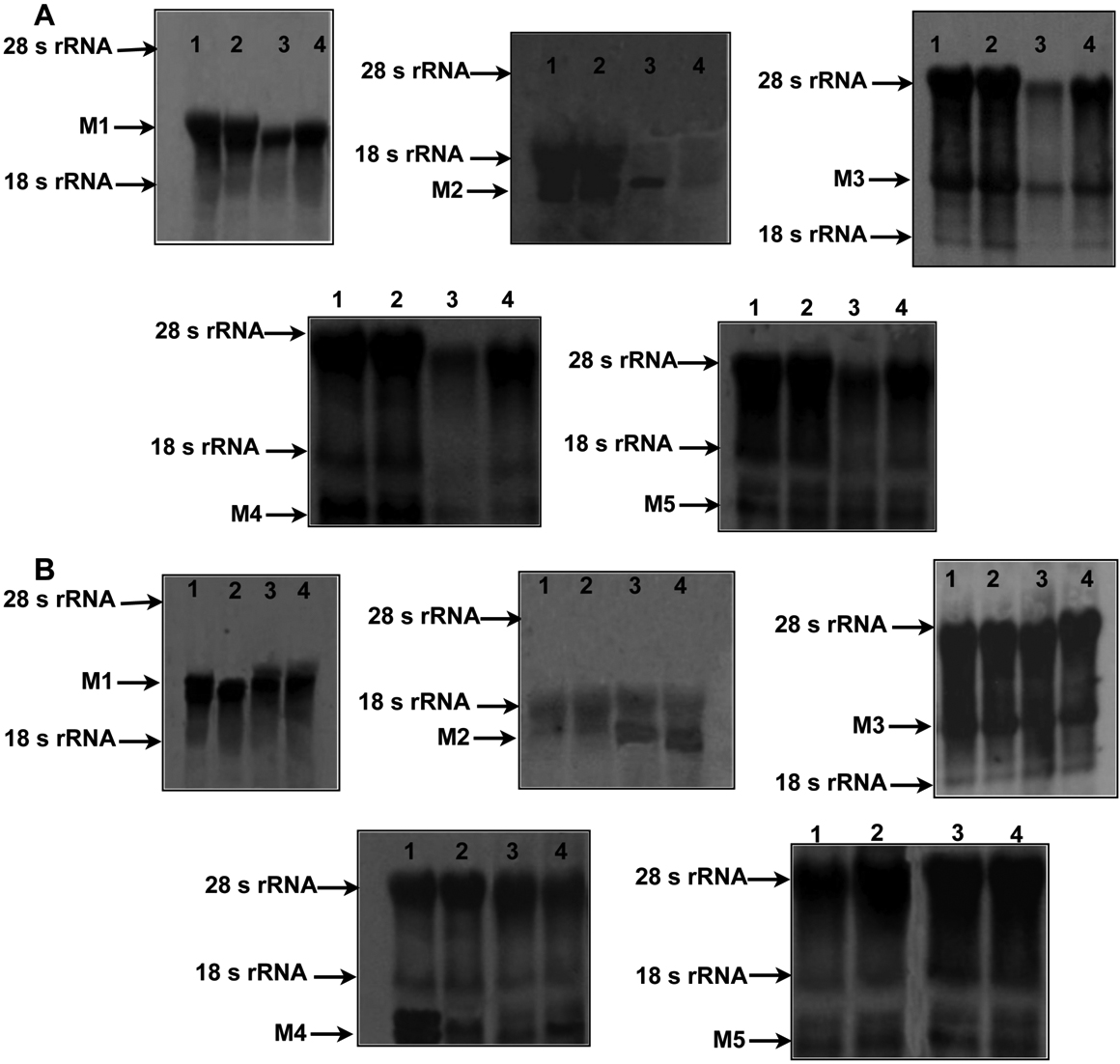 28S (4.7 kb), 18S (1.9 kb) rRNA and M1-M5 (2.6 kb, 1.8 kb, 3.2 kb, 1.6 kb and 3.5 kb, respectively) are indicated to the left. A: Lane 1: Mouse brain cerebellum (positive control), lane 2: minus lens treated myopic sclera, lane 3: minus lens control