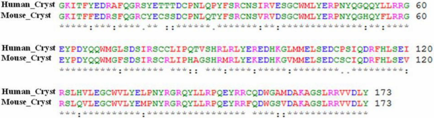 Sequence alignment of wild type human γC-crystallin and mouse γC-crystallin (PDB ID: