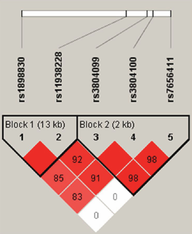 Figure 1. Linkage disequilibrium plot of five SNPs of