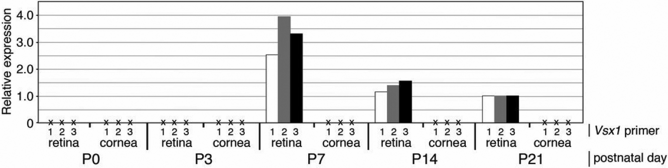 point. The y-axis shows Vsx1 expression relative to expression on postnatal (P) day 21. x-axis shows postnatal day, tissue, and Vsx1 primer set number.