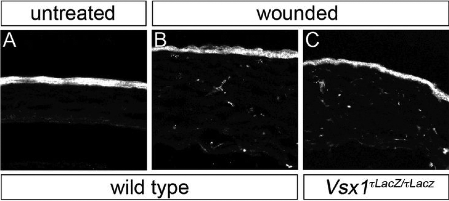Non-specific immunolabeling of alkali-wounded corneas. Panels