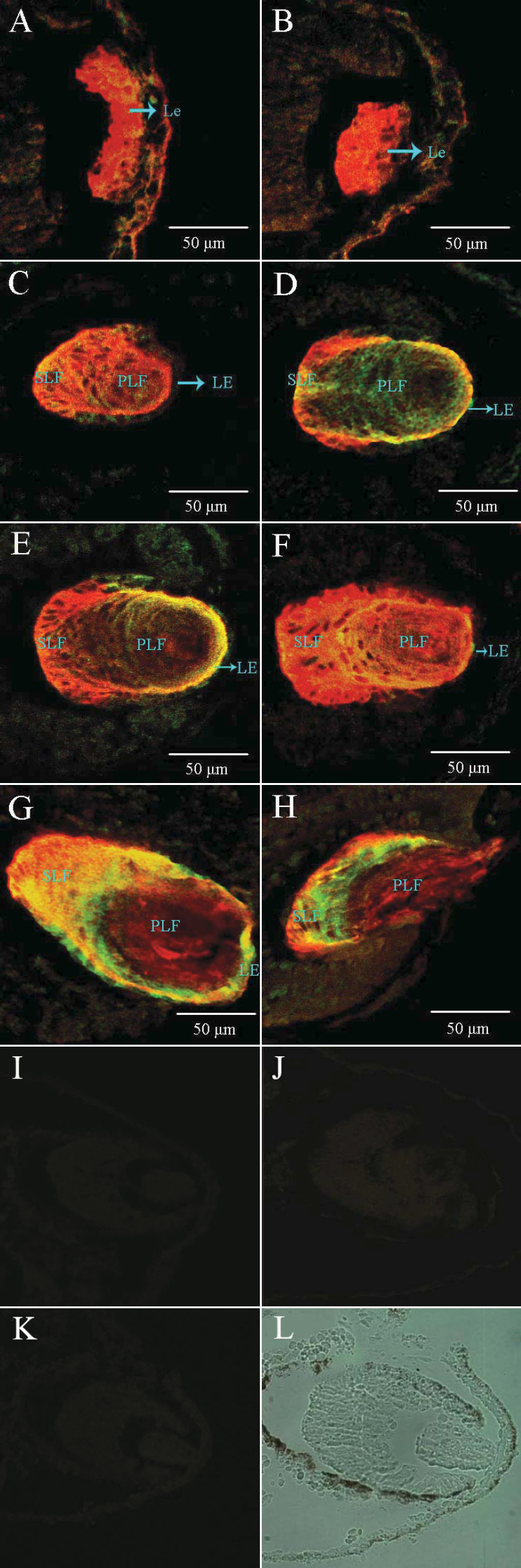 primary fibers and secondary primary fibers are formed during stage 34–46 (C-H). Negative controls: I (without antibodies); J (only secondary antibodies); K (only primary antibodies); L: differential interference contrast (DIC). Abbreviations: Le, lens; PLF, primary lens fiber; SLF, secondary lens fiber.