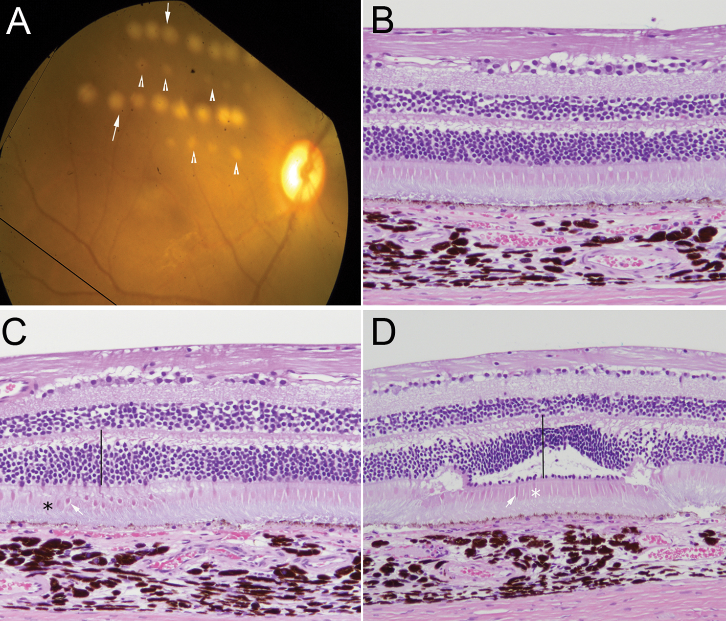 (arrow), and mild disruption of photoreceptor outer segments (*) and