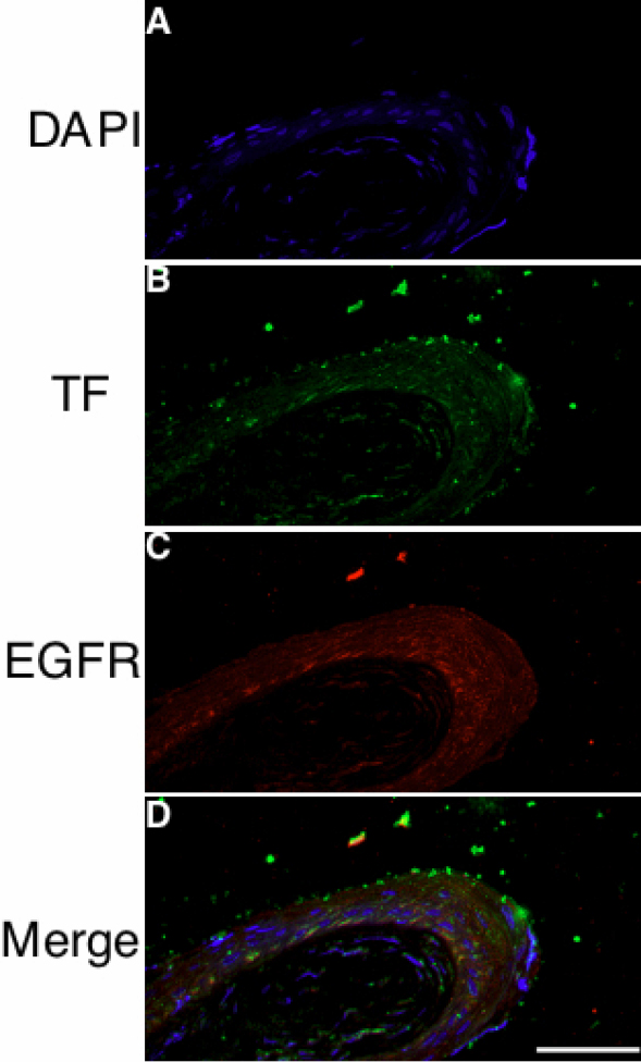 TF immunoreactivity are shown in A and B, respectively. C, D: EGFR immunoreactivity was observed broadly in pterygial epithelial cells. The scale bar represents 50 μm.
