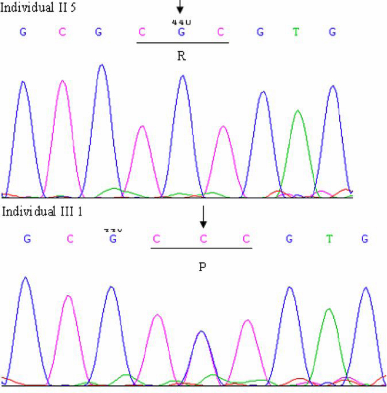 Figure 3. Forward sequence chromatogram of exon 2 of CRYGD. The arrow indicates the G >C transition. Individual II5 is unaffected (upper panel), III1 is affected (lower panel). The