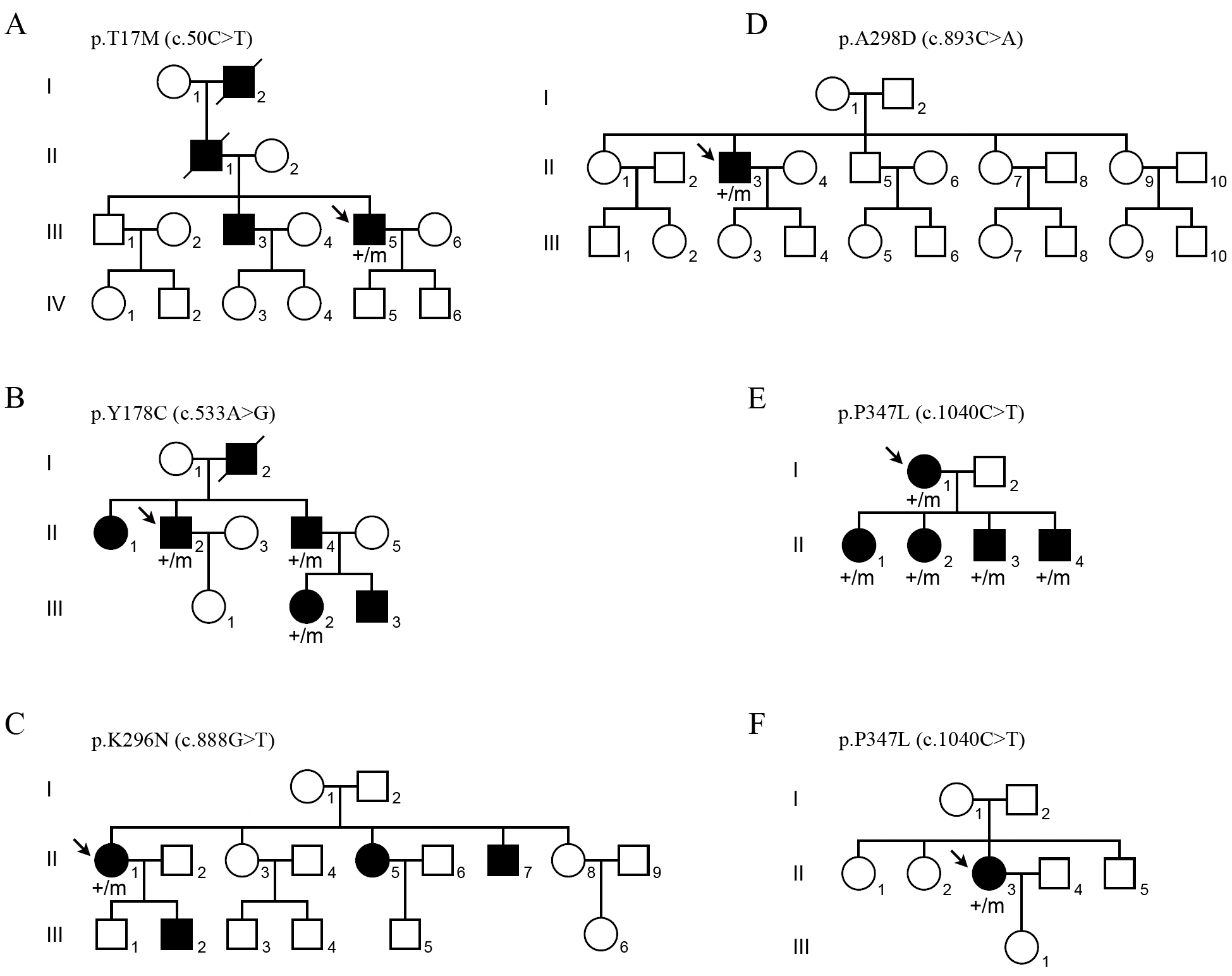 “m”; wild-type alleles are represented by “+”; arrows indicate probands.