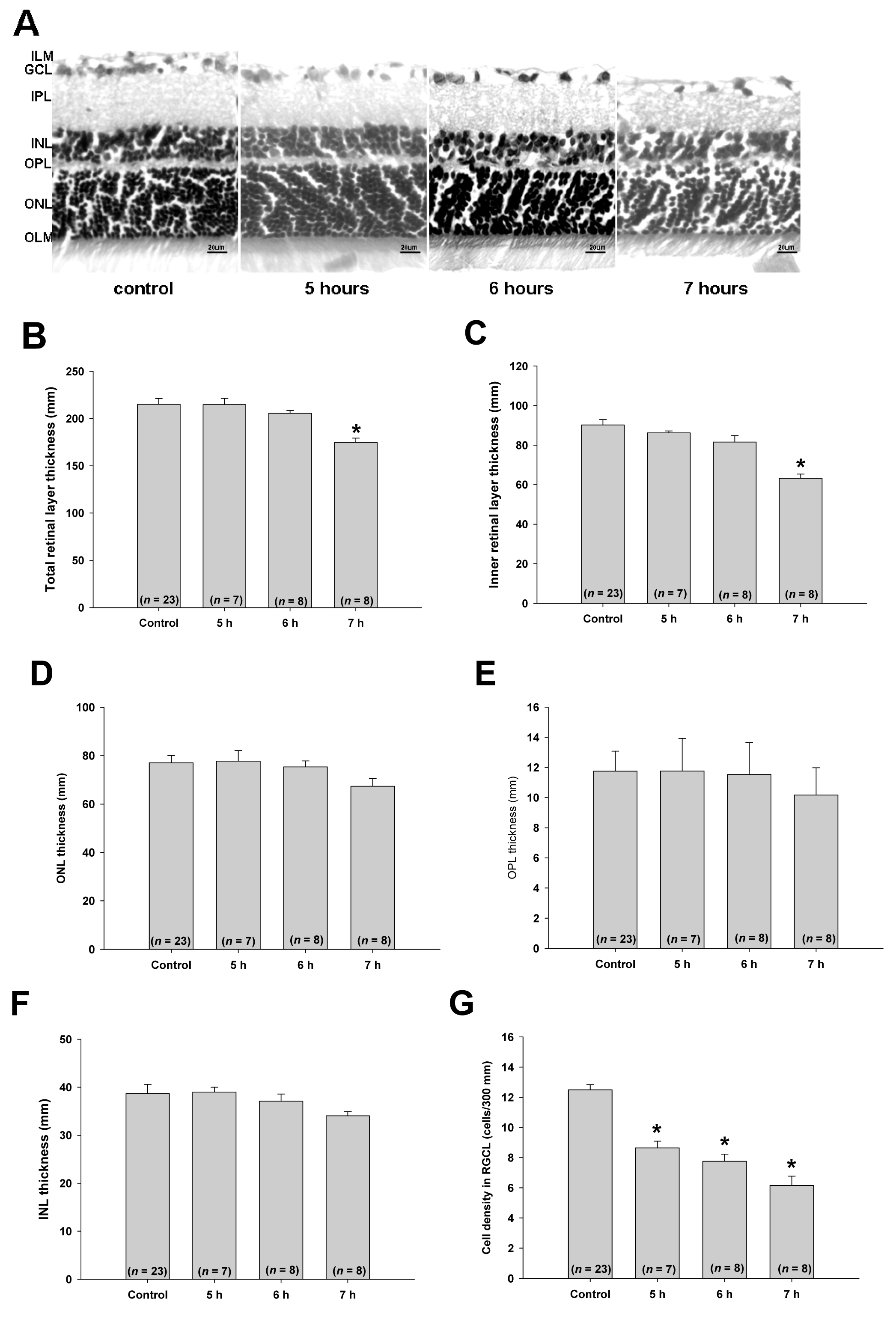 (F), and cell density in the GCL (G) were quantified and