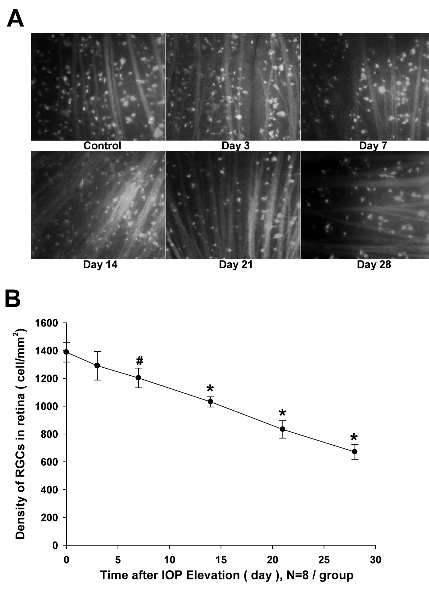 central retina, showing a time-dependent loss of RGC. B: