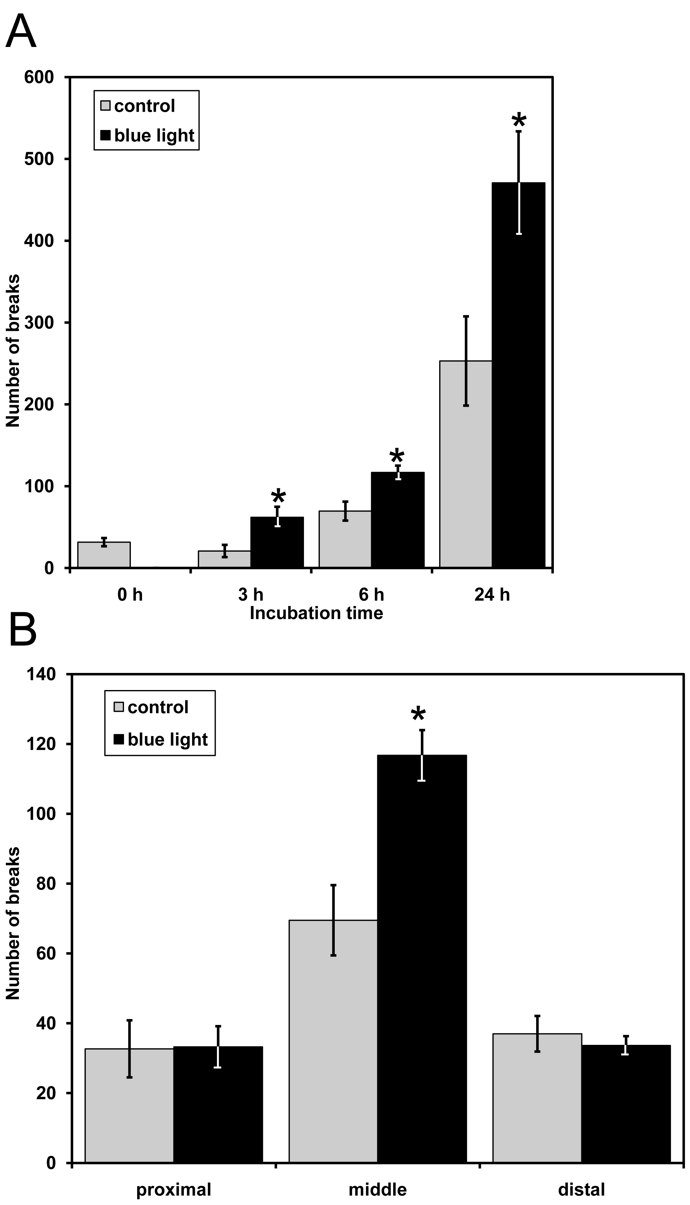 to blue light for 3 h, 6 h, and 24 h. The graph displays the number of