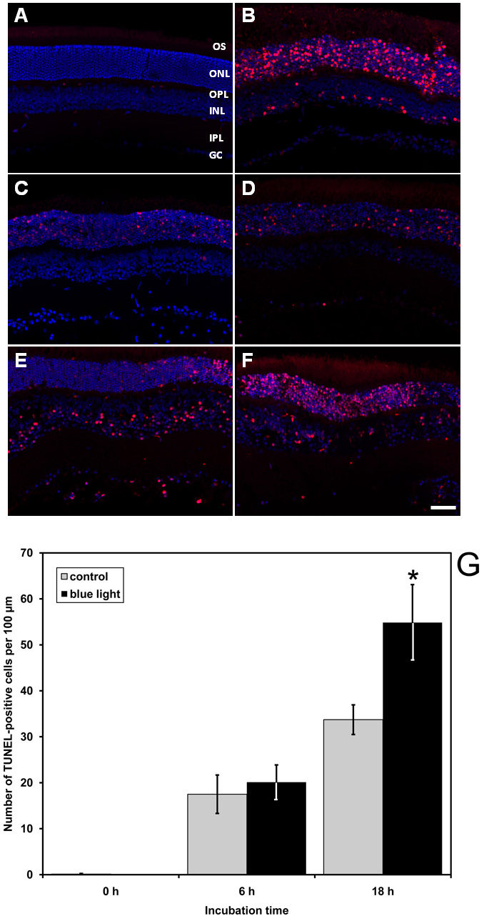especially in the outer nuclear layer (ONL). Retinas were not treated (E) or were irradiated (F) with visible blue light for 18 h. The number of TUNEL-positive cells significantly increased in blue light-damaged retinas