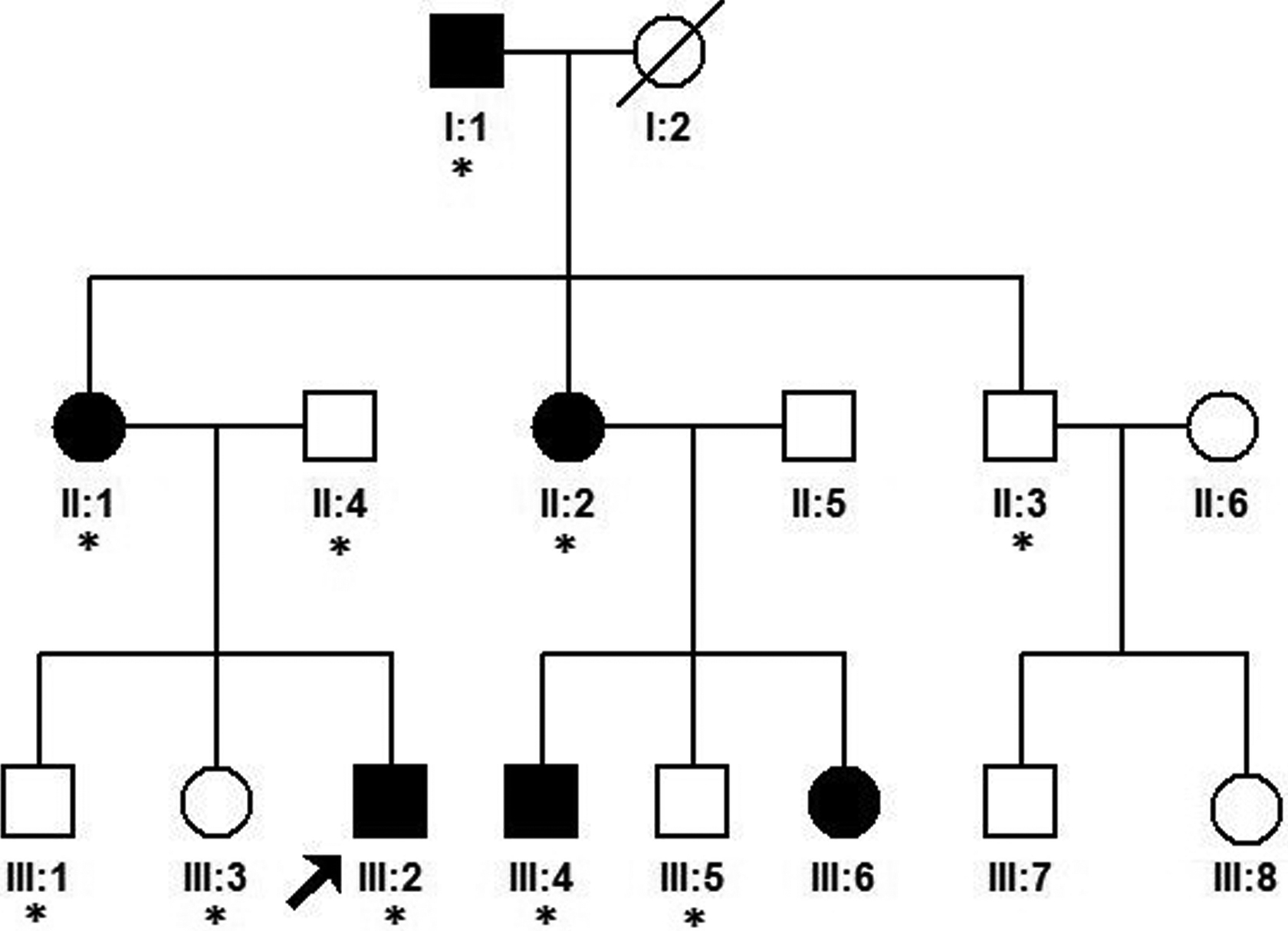 Pedigree of a cataract family. Pedigree of a three-generation family with congenital cataract. The black arrow indicates the proband. The asterisk indicates family members who attend this study.