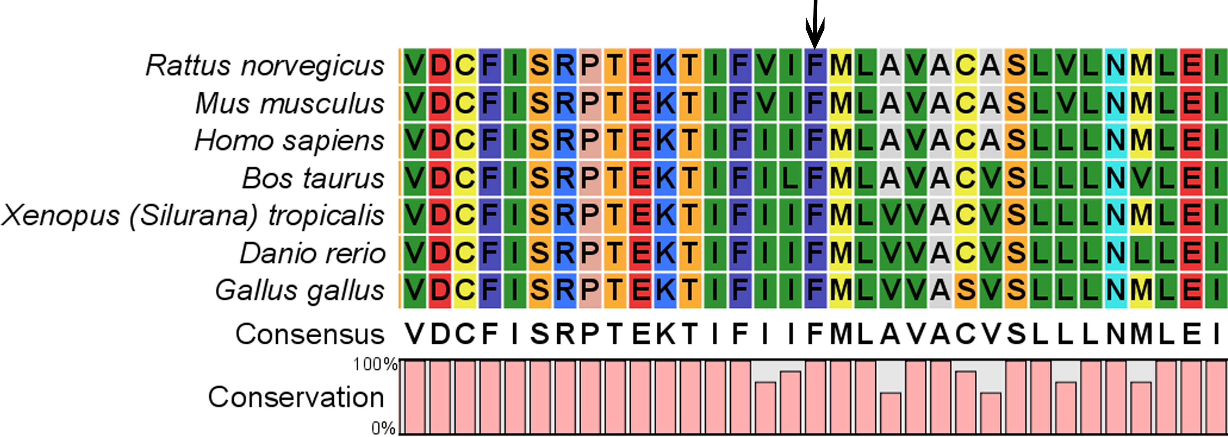 A multiple-sequence alignment in connexin 46 from different species. The alignment data indicates that the Phe at position 206 is highly conserved in different species (indicated by an arrow).